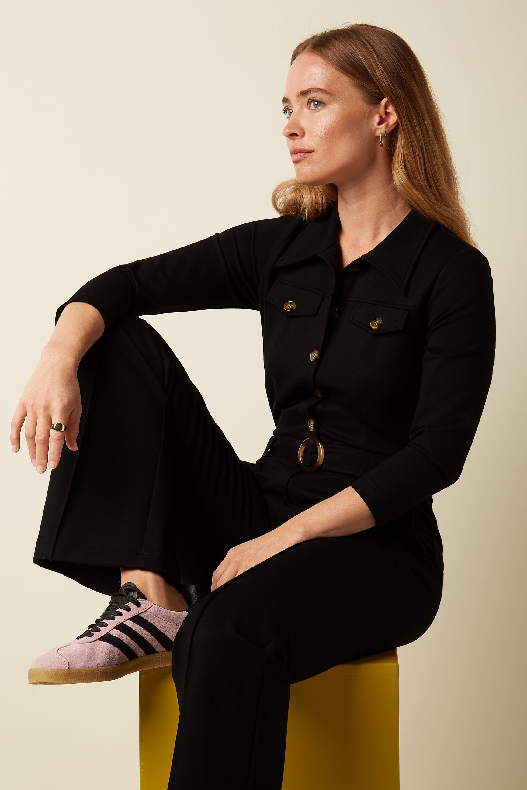 Alexa samfestingurinn er í beinu sniði með 3/4 ermum. Hann er úr ofnu viskósuefni með beltisbandi og lokanlegum brjóstvösum og vösum á mjöðmum. Samfestingurinn lokast með rennilásum og hnappalokun.