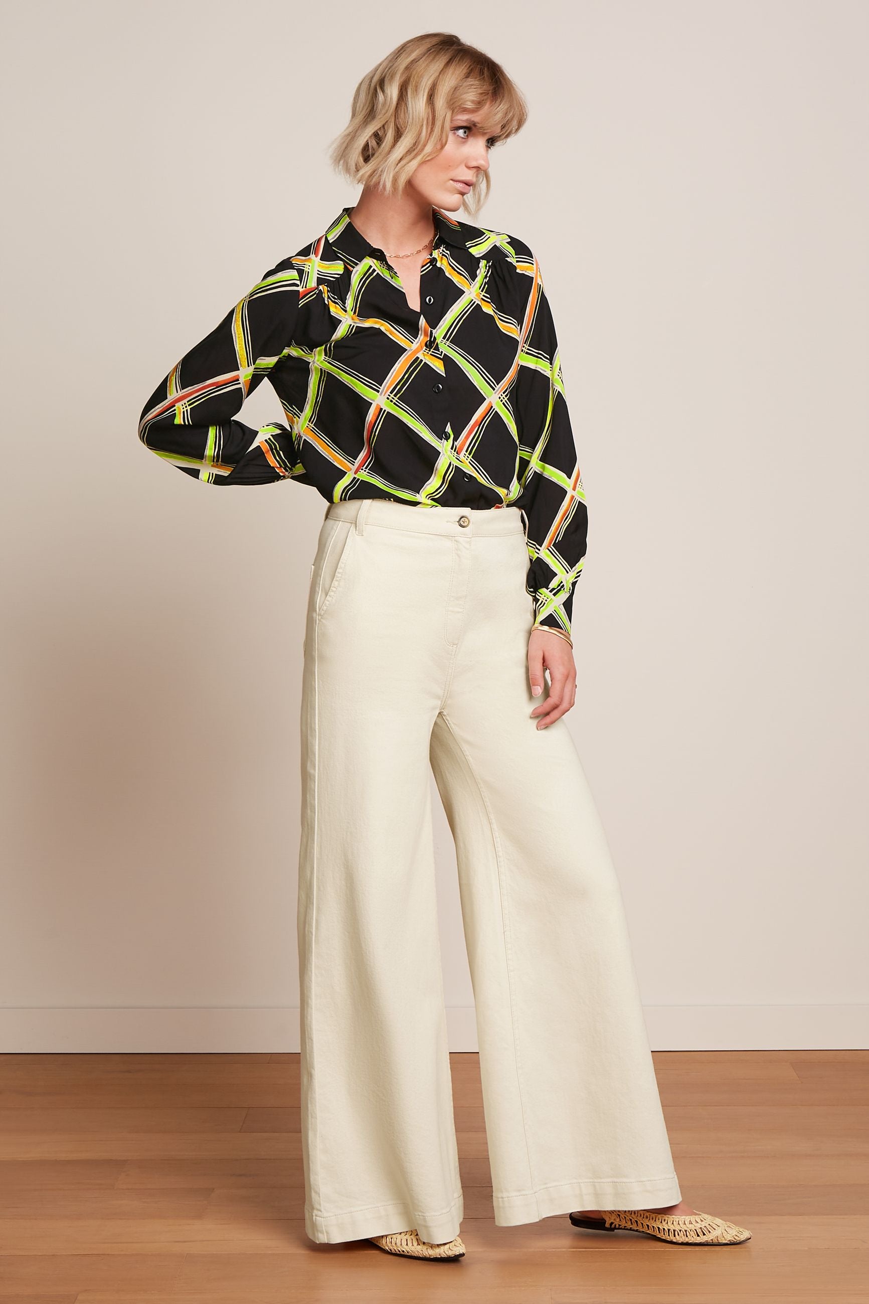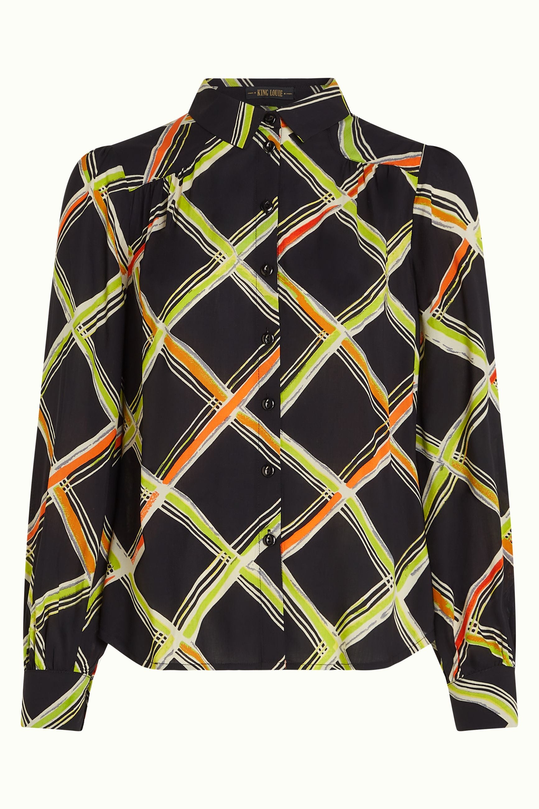 Lýsing: Skrautleg langerma blússa. Hún er með flatterandi fellingar við axlir og ermar.