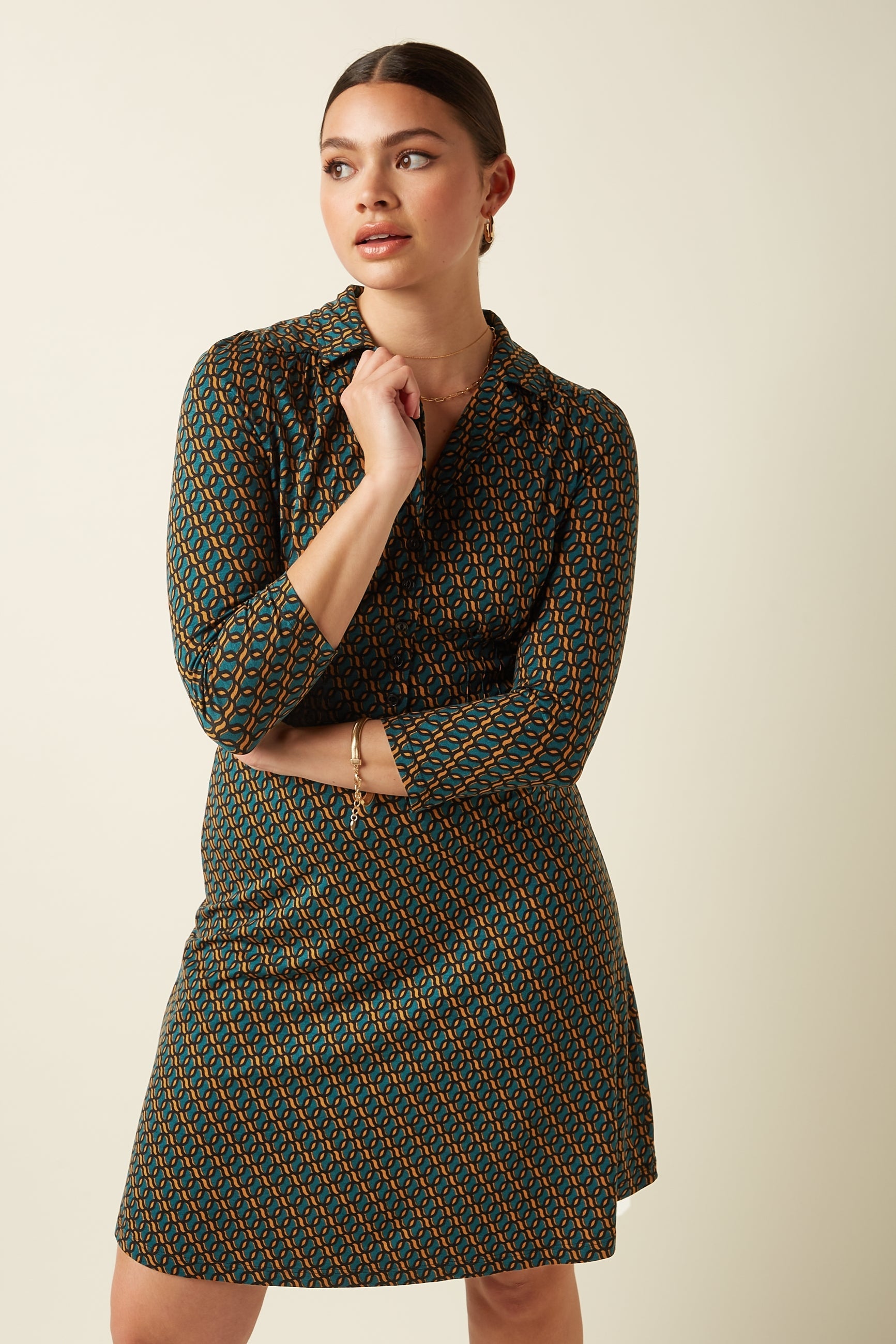 Diner Brisk kjóllinn færir skemmtilega stemningu í fataskápinn þinn með krúttlegum rikkingum í mittisaumnum og líflegu grafísku prenti. Hann er úr teygjanlegu viskósuefni, með hnappalokun á efri parti, skemmtilegum 3/4 ermum, klassískum kraga og útvíkkuðu midi-pilsi.
