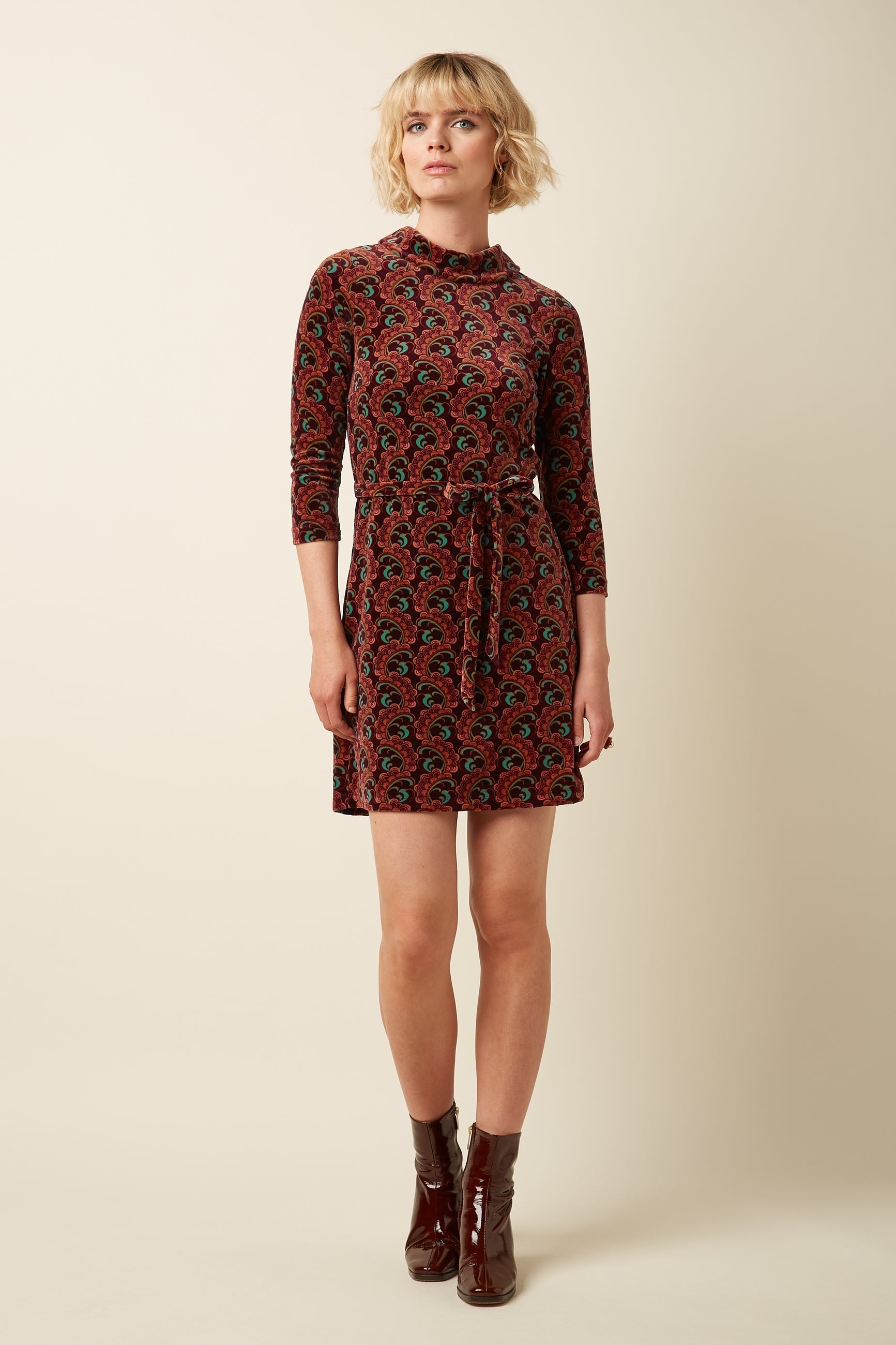 Dita Winkle kjóllinn er úr mjúku, teygjanlegu bómullarjersey-flauelsefni með glæsilegu paisley-mynstri. 3/4 ermarnar og stillanlegt beltisband gerir þennan kjól að stílhreinum og þægilegum valkosti fyrir öll tilefni.